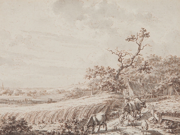 Cats Landschaftsauffassung vermittelt zwischen dem Golden Zeitalters des 17. Jahrhunderts und der anbrechenden Romantik. Der Zeichenstil ist altmeisterlich präzise. Mehr Naturalismus zeigt sich jedoch im unspektakulären Dorf im Hintergrund, dem vom Bildrand überschnittenen Kornfeld und dem weiten Himmel.