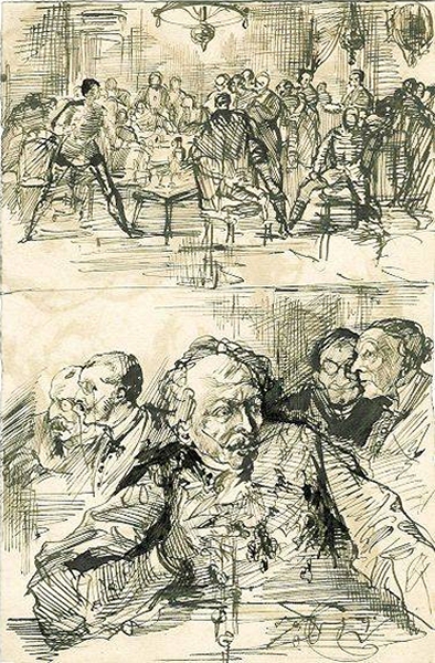 (B) Im Offizierskasino, darunter Männergruppe, verso weibliche Charakterköpfe in Renaissancekostümen