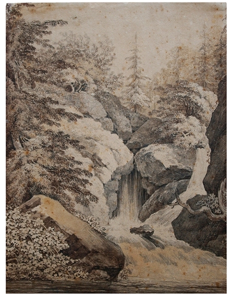 Grafit, Feder und Lavierungen in Braun und Grau, 309 x 233 mm