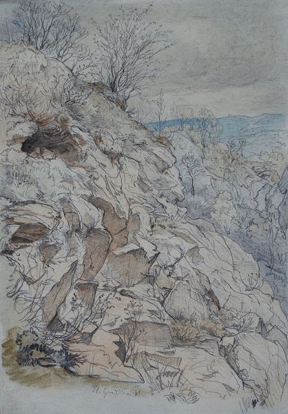 Der Aufschrift zufolge entstand die Zeichnung 1861 im Plauenschen Grund nahe Dresden, der wegen seiner Felsformationen von den Malern geschätzt wurde. Die Zeichnung stammt eindeutig von einem Schüler Ludwig Richters, und hier ist aufgrund der Untersicht, des nahsichtig aufgenommenen Gesteins und der zittrig wiedergegebenen pflanzlichen Details am ehesten an Carl Wilhelm Müller zu denken. Zusammen mit Albert Venus und Viktor Paul Mohn bildete er die Gruppe hochbegabter Landschaftsmaler aus Richters Schülerkreis und reiste 1861 mit ihnen nach Böhmen. Michael Thimann