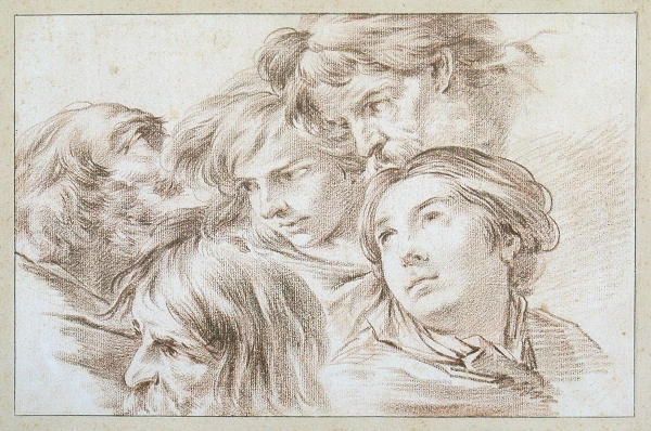 Die rasch gezeichneten kontrastreich aufgefassten Männerköpfe unterschiedlichen Alters und unterschiedlicher emotionaler Haltung verleihen der Rötelzeichnung eine starke Lebendigkeit.