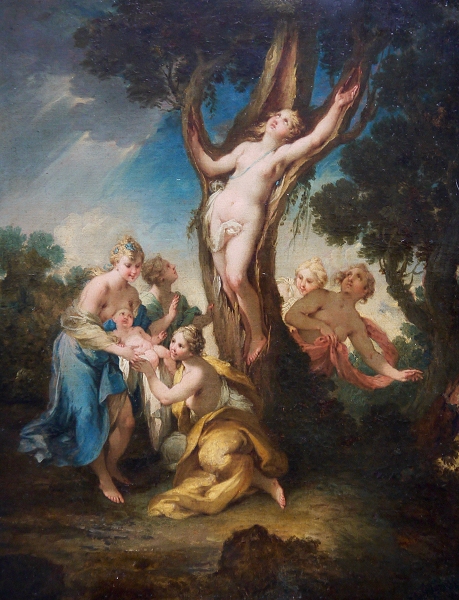 Bildgegenstand ist die Verwandlung Myrras in einem Baum. Schöngliedrig und durch ihre helle Hautfarbe hervorgehoben wird sie im Bildzentrum von einem Baum umschlungen. Adonis, der unten links zu sehen ist, befindet sich bereits in der Obhut fürsorglicher Nymphen.