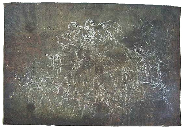 Lassen diese Blätter zunächst an jene Helldunkelzeichnungen denken, die Giacomo Cavedone (1577 - 1660) in Bologna einführte und Giovanni B. Castiglione (1610 - 1665) weiterentwickelte, stehen unsere mit schroffem, suchenden Strich ausgeführten gedrängten Kompositionen den Viehstücken des Peter Philip Roos oder Jakob Roos (1682 Rom - nach 1730 Neapel) näher. Die skizzenhaften Abreviaturen des linearen Gerüsts, deuten darauf hin, daß es sich um Unterzeichnungen für Ölstudien handeln dürfte.