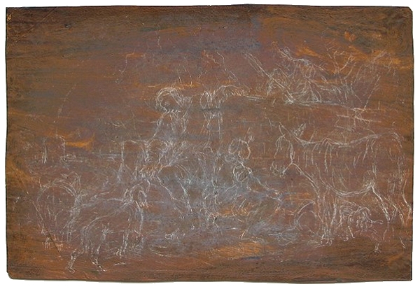 A) Weiße Kreidezeichnung auf mit brauner Ölfarbe grundiertem Papier, 390 x 575 mm