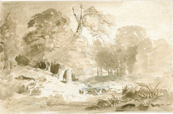 Tusche in Braun über Bleistiftskizze auf Bütten mit Wasserzeichen