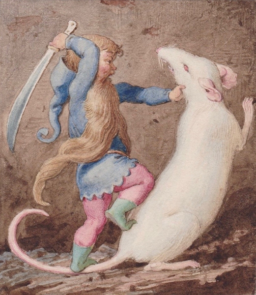 Vermutlich handelt es sich bei diesem skurrilen Zweikampf zwischen einem Zwerg mit gewaltigem Bart und einer weißen Ratte mit roten Augen um eine Episode aus einem Märchen. Das Format läßt an die Vorlage einer Buchillustration denken.